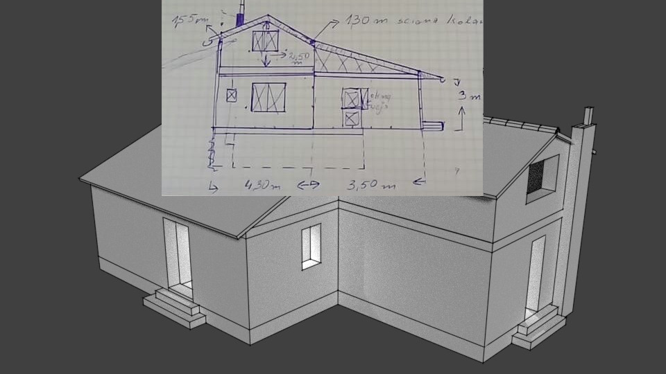 Tutaj prezentuję poglądowy rysunek domu, który stworzyłem dla mojego znajomego na podstawie