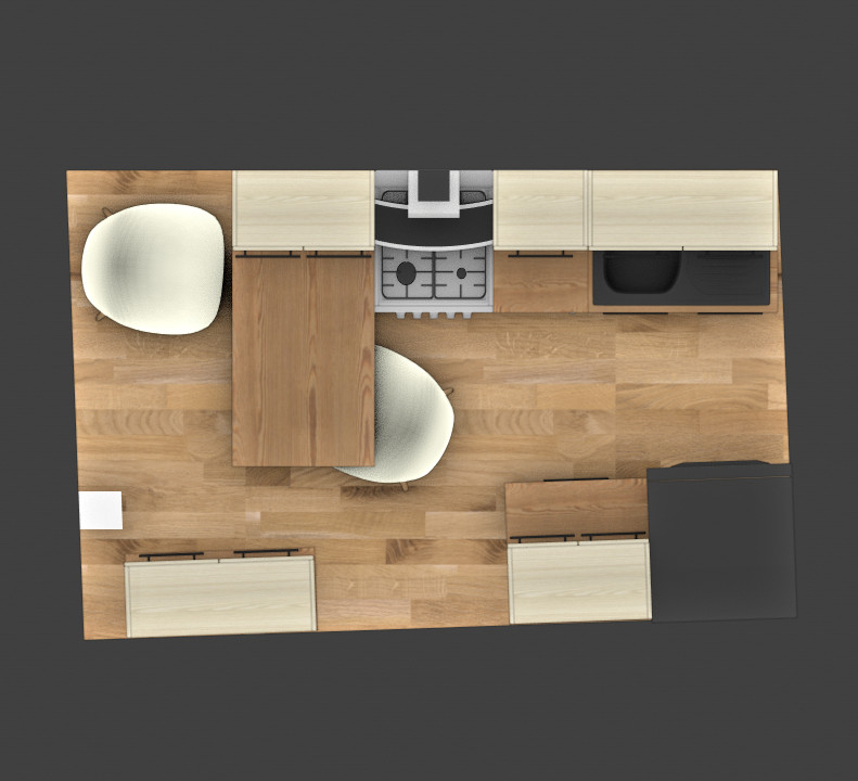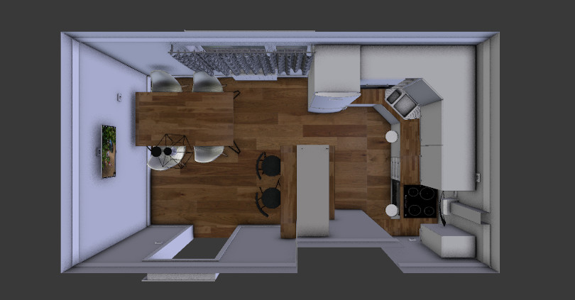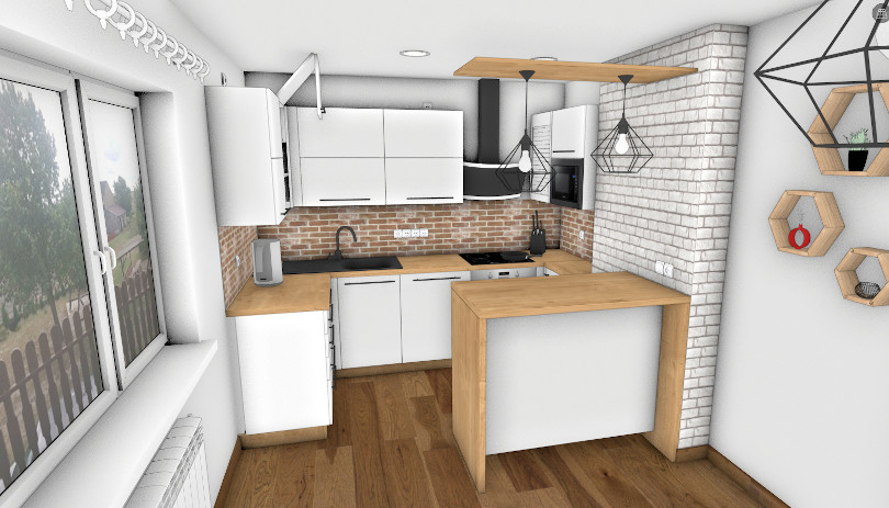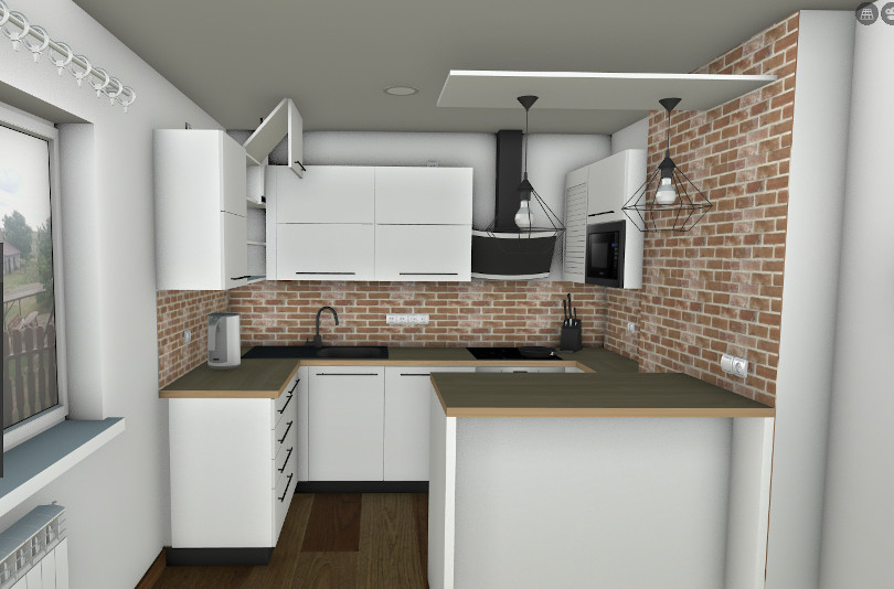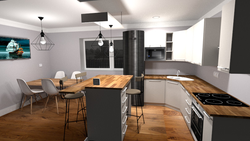 Prezentuję widok aranżacji kuchni, którą zaprojektowałem zgodnie z otrzymanymi wytycznymi oraz moimi sugestiami.